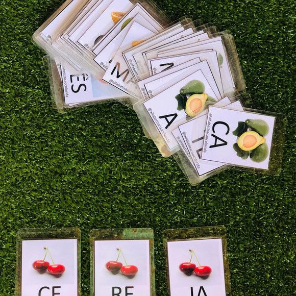 41 flashcards de sílabas para formar palavras, nomes de frutas. Cada carta mede 5,5x8,5